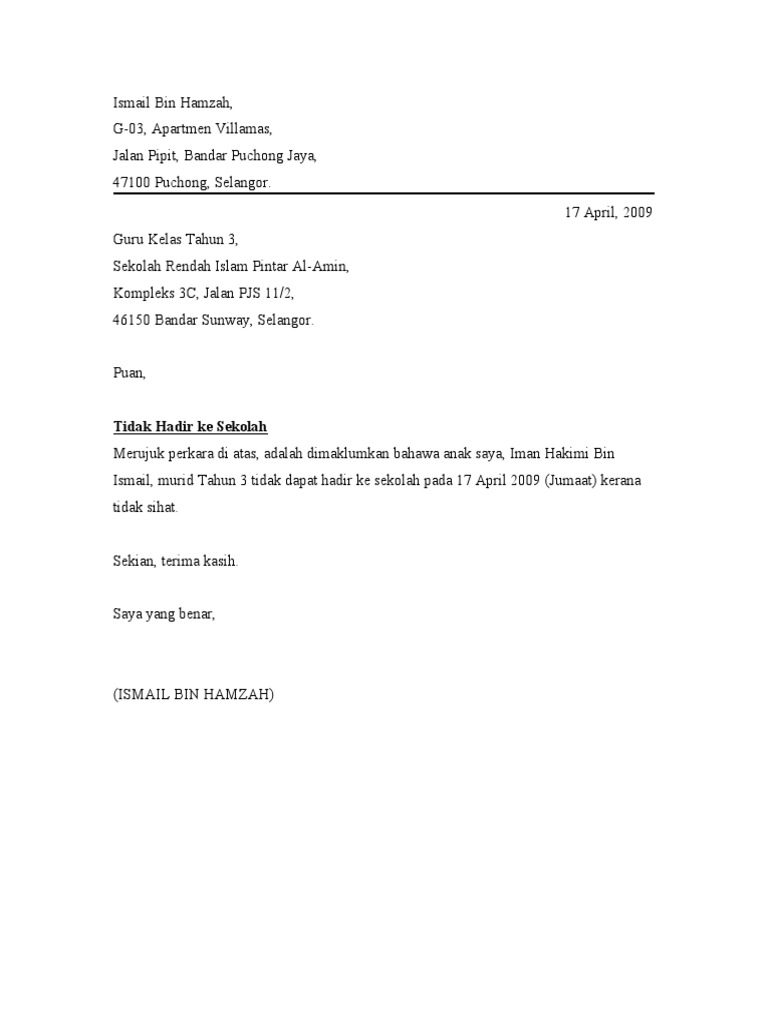 Saya ahmad bin said bapa kepada murid bernama yusman bin ahmad dari kelas 5 bestari ingin memaklumkan sebab anak/jagaan saya tidak hadir ke sekolah pada tarikh 30 januari 2018. Bagian ini menyatakan alasan yang menyebabkan mengapa sehingga siswa yang disebutkan nama dalam surat tidak bisa hadir ke sekolah. Bagi para pelajar yang tidak dapat hadir ke sekolah sudah pasti mereka perlu memaklumkan kepada pihak guru atau pihak sekolah mengenai ketidakhadiran mereka untuk memaklumkan hal tersebut sudah pasti ibu bapa pelajar perlu menghantar surat. Lhdn, surat rasmi syarikat, surat rasmi tidak hadir sekolah, surat rasmi permohonan pembekal, surat rasmi permohonan tukar kelas contoh surat rasmi permohonan untuk menambah subjek/kursus via www.scribd.com. Anak jagaan saya tidak dapat menghadirkan diri ke sekolah disebabkan mengalami demam yang bermula 26/07/2012 setelah pulang dari sekolah. Surat izin kuliah karena pulang kampung. Surat tak hadir ke sekolah atas urusan keluarga. Puan, pemberitahuan sebab tidak hadir ke kuliah untuk kursus cc201 ukur kejuruteraan 2 saya seperti penama di atas ingin memberitahu ketidakhadiran saya ke kelas cc201 ukur kejuruteraan 2 selama 3 (tiga) jam. Anak saya tidak dapat hadir ke sekolah pada tarikh berkenaan kerana perlu bersama keluarga menghadiri majlis perkahwinan abangnya di johor/ada pembacaan wasiat keluarga/ada konflik keluarga/ada urusan yang agak. Kami sekeluarga perlu sampai ke klia pada jam 5.00 pagi untuk oleh yang demikian, beliau tidak dapat menghadiri kelas pada yang yang dimaklumkan di atas. Nama atau alamat guru kelas/guru besar/pengetua lazimnya, surat tidak hadir ke sekolah dihantar sama ada kepada guru kelas. Ibu ayah atau pelajar boleh gunakan panduan di sini dalam menulis surat tidak hadir ke sekolah untuk diberikan pada guru kelas. 9 contoh / cara tulis surat tidak hadir ke sekolah.