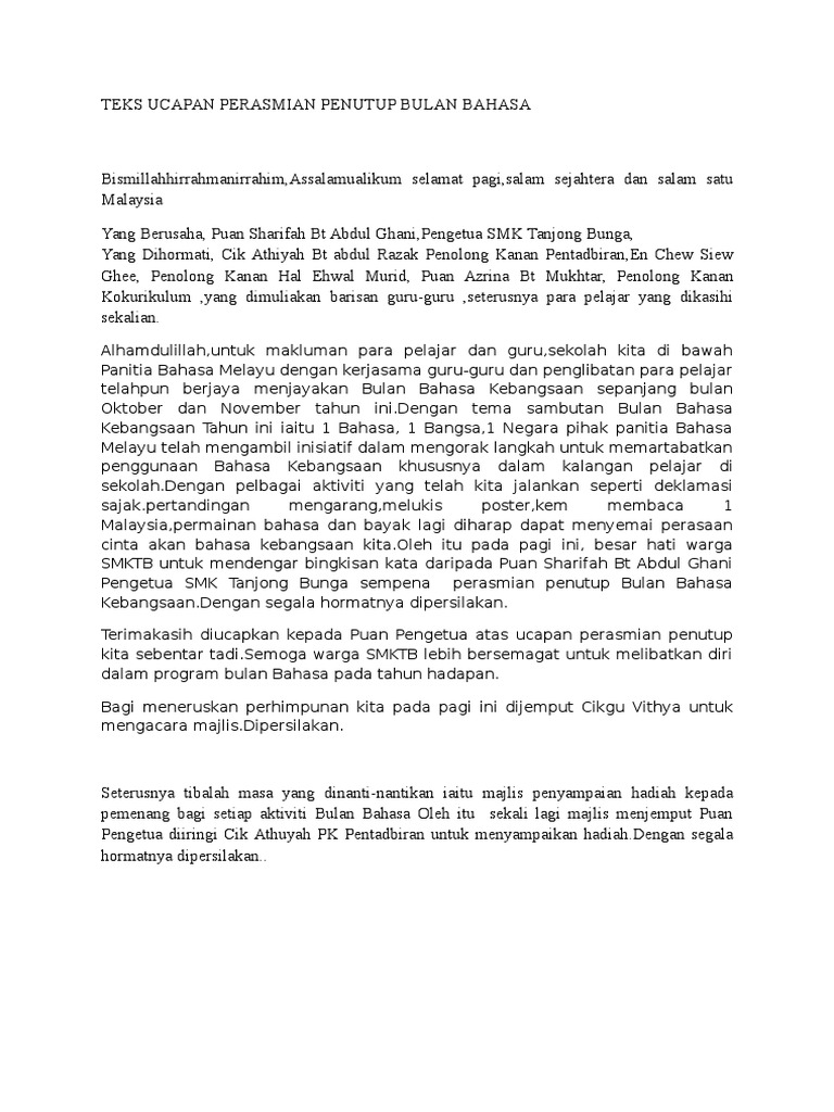 Jutaan terima kasih diucapkan kepada tuan guru besar kerana sudi menyampaikan ucapan dan menyempurnakan perasmian sebentar tadi sebentar tadi. 4) selamat datang ke majlis pelancaran bulan kemerdekaan peringkat sk taman molek. Faizuddin hashim @teks pengerusi majlis. Kreatif murni @koleksi teks pelancaran. Untuk memberkati lagi majlis kita pada hari ini saya menjemput dan mempersilakan saudara zul hasanain bin hasim untuk mengaminkan. 'irimu umpama nyiur bertuah, padat ari harum me%angi# curah erbat di. Majlis dengan segala hormatnya, mempersilakan. Bulan oktober adalah bulan yang bermakna buat kita semua. Saya percaya tema ini akan memberikan kesan mendalam dan melahirkan semangat kecintaan terhadap. Kita kembali ke segmen teks pengacara majlis. Contoh teks pengacara majlis majlis perkahwinan adha & azwan. Pelancaran bulan bahasa kebangsaan sksd 2019. Sambut merdeka sekali setahun keringat tercurah pejuang berjasa malaysiaku pihak majlis merakamkan penghargaan terima kasih kepada yang berusaha tuan hj murtaza bin hj abu bakar atas kesudian menyampaikan ucapan dan.